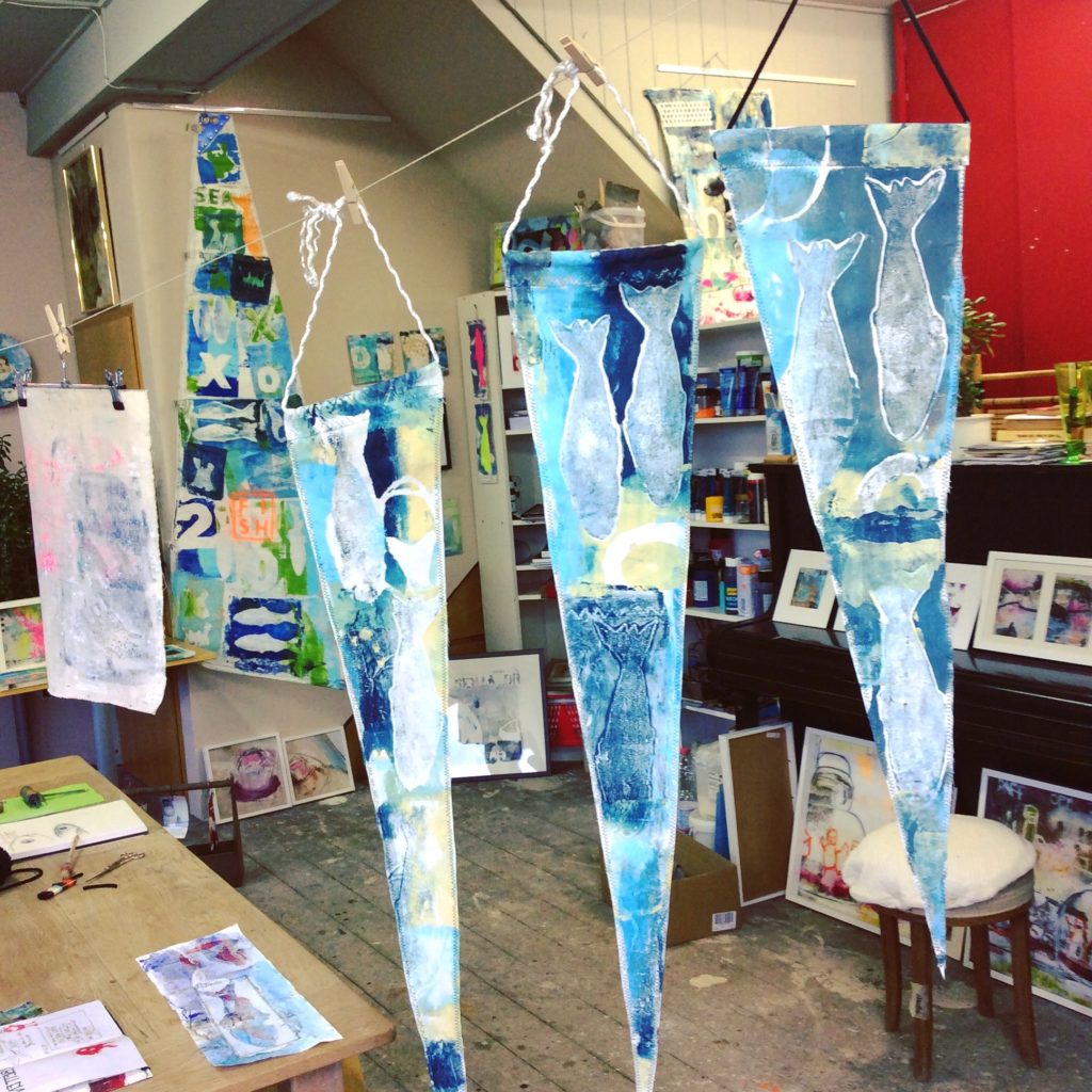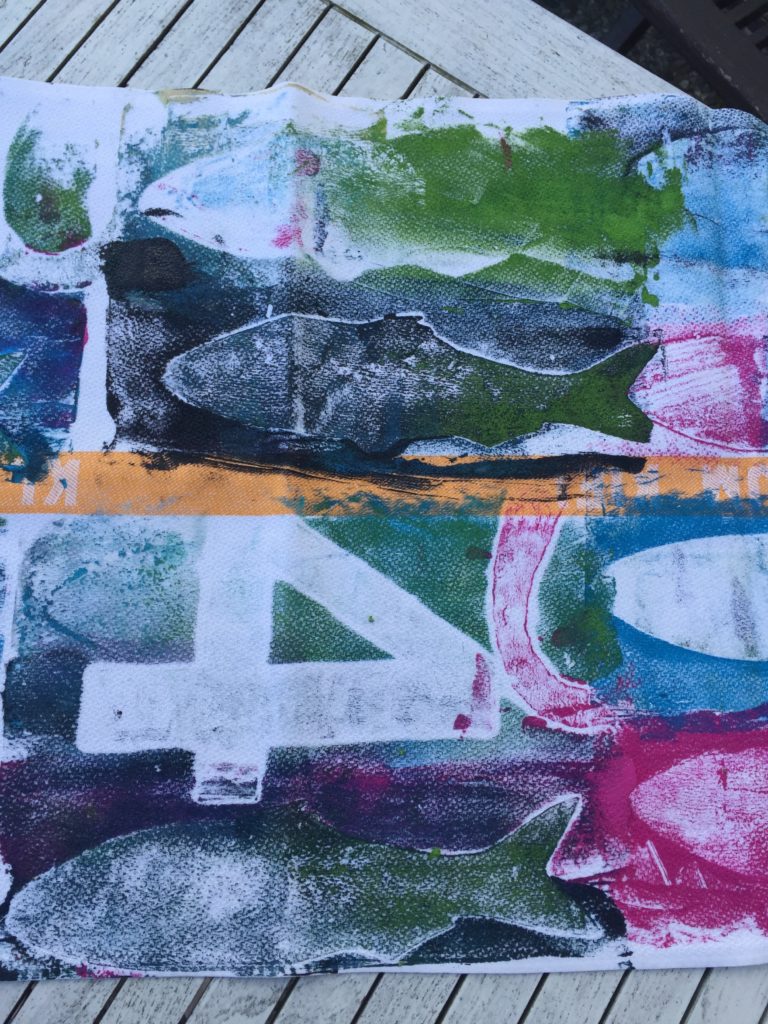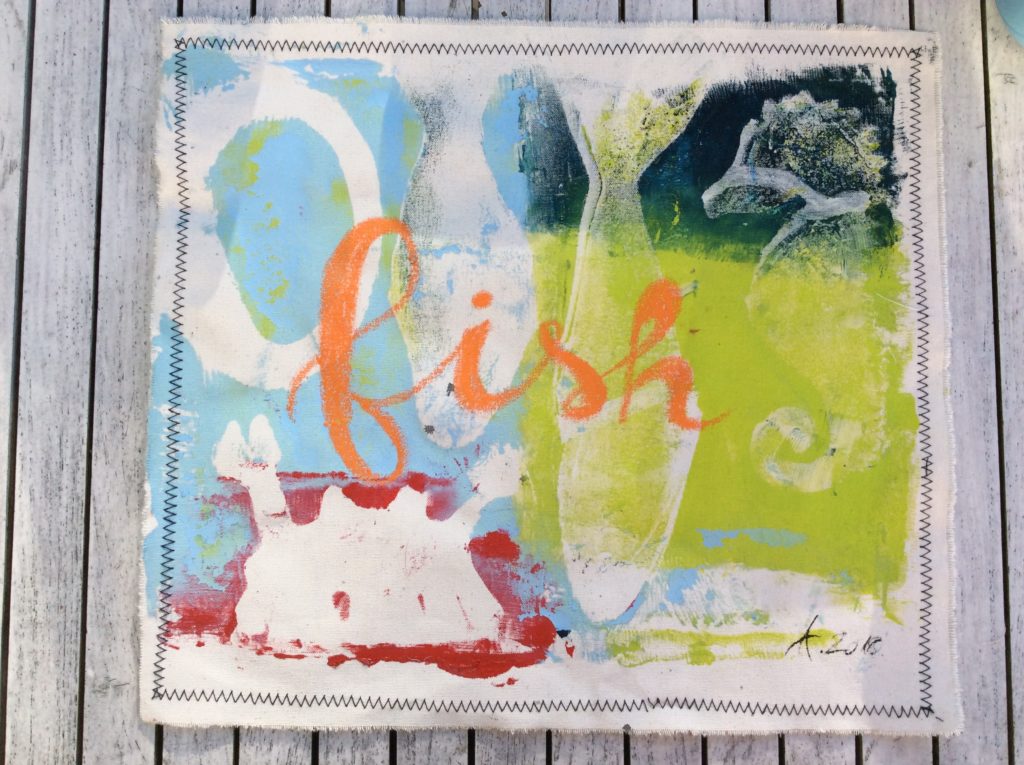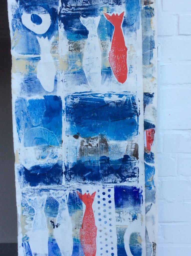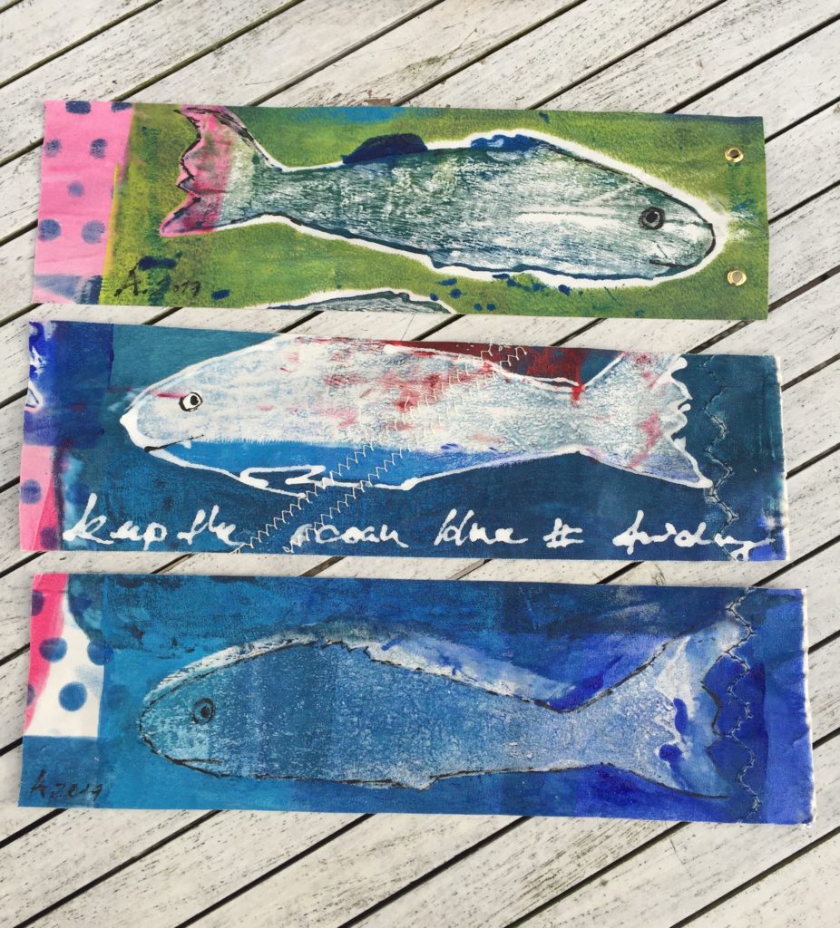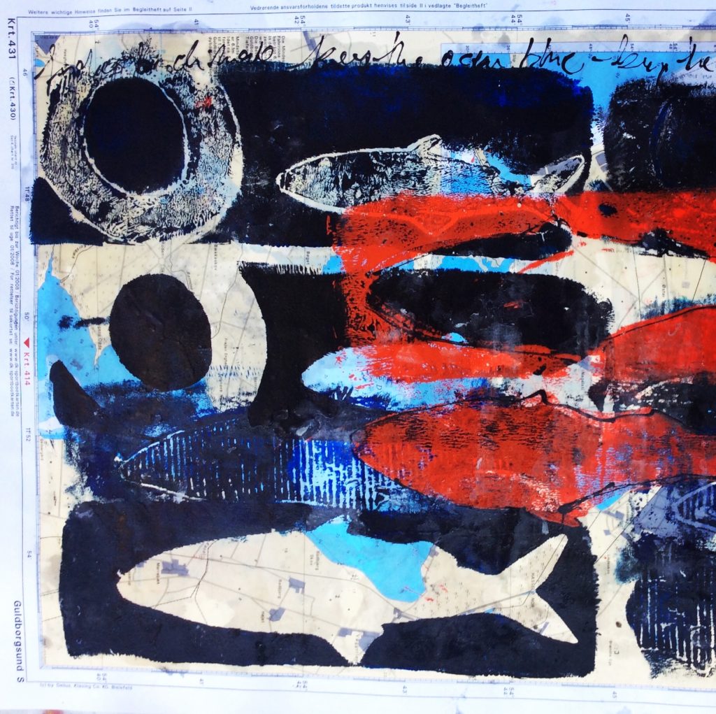 Seit dem Auszug aus ihrem Atelier im Anscharpark Kiel nach Heikendorf an die Ostsee widmet sich die Künstlerin dem Drucken, genauer gesagt der Monotypie. Die Monotypie („ein einziges Bild“), das sie mehrfarbig herstellt, entsteht durch das Auswalzen der Druckplatten mit verschiedenen Farben und dem Auflegen von eigens dafür hergestellten Schablonen. Damit gelingt ihr, die ja ursprünglich aus der experimentellen Malerei kommt, die perfekte Verbindung von Malerei, Zeichnung und Grafik. Jeder Druck ein Original, das dann zur Weiterbearbeitung durch Graphitkreide, Kohle, Tinte uvm. unzählige zusätzliche Ausdrucksmöglichkeiten bietet. Bereits seit dem 17. Jahrhundert als Verfahren der Bildenden Kunst entwickelt, nutzt Anett Schadowski diese Technik jetzt um kraftvoll in Farbe und Ausdruck, dennoch aber mit Leichtigkeit ihre Botschaften auf gebrauchte Segel, alte Leinwände, hauchdünne Japanpapiere, und diverse gebrauchte Materialien zu arbeiten. Immer wieder finden sich Hashtags, wie #keeptheoceanclean und #fridaysforclimate als Appelle an unsere Verantwortung der Umwelt und dem Klimawandel gegenüber in ihren Arbeiten. „Wenn du am Meer wohnst, kannst du auch Fische“, hat mal jemand zu ihr gesagt. Ja, kann sie! Bunte, leuchtende, gute Laune- Fische in gesundem, sauberen Wasser. 2019 nB