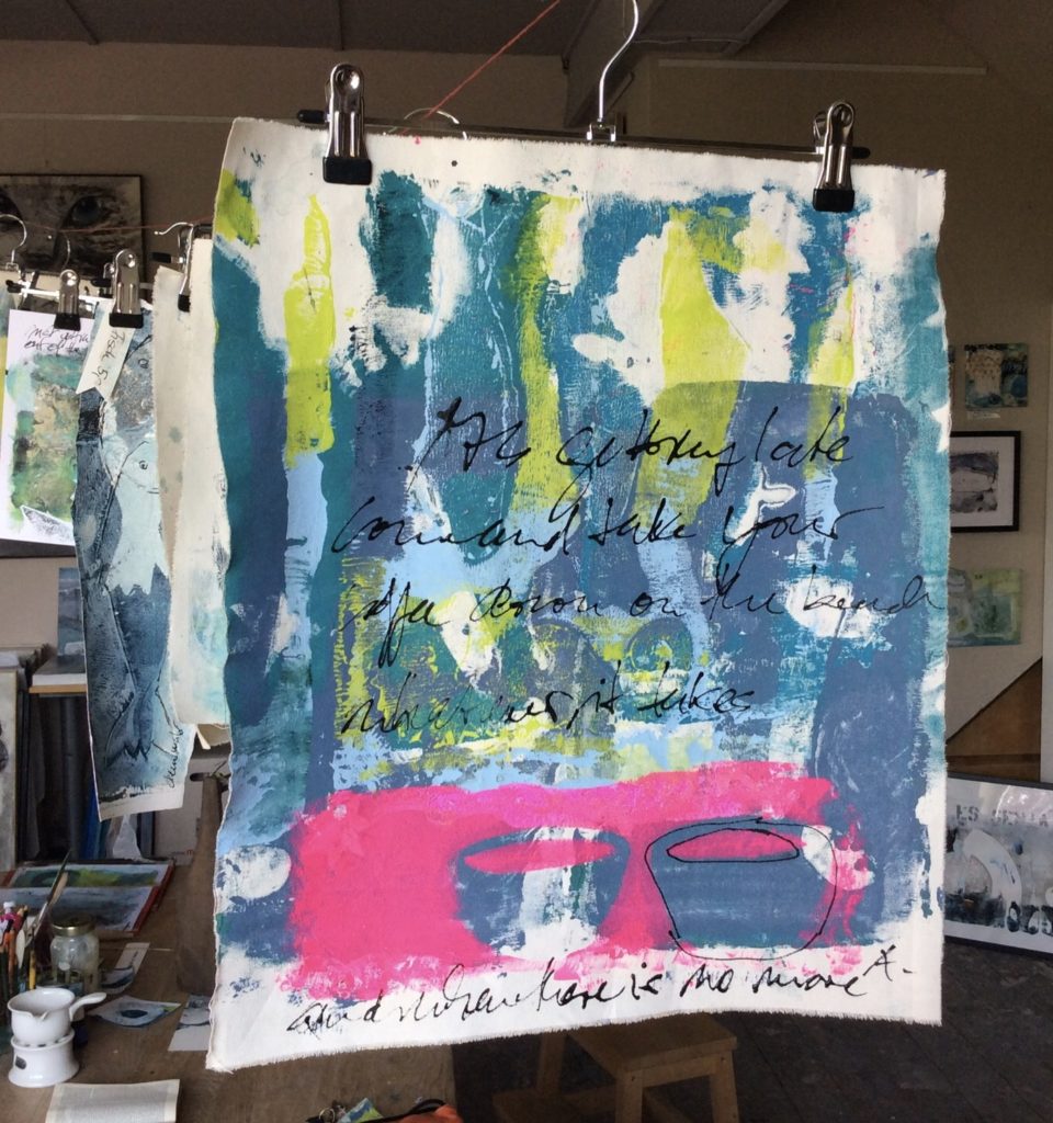 Anett Schadowski Anett Schadowski, print and hand lettering on paper 2019 bring me down where the wonderful fish live Anett Schadowski print and hand lettering on used towl, 2019 print on sea chart Anett Schadowski print and handlettering on used canvas, 2018 34,5×37 print on used main sail 2019 print and handlettering on used canvas 34×36 2018 print and handlettering on used canvas 45×120 2018